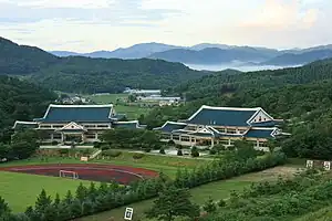 Korean Minjok Leadership Academy (KMLA; Korean: 민족사관고등학교, Hanja: 民族史觀高等學校; Minjok Sagwan Godeunghakgyo, lit. '"People's History High School"')[2][3][4][5][6] is a co-educational, independent boarding high school near the town of Hoengseong, Gangwon, South Korea, 120 kilometers (75 mi) east of Seoul at an elevation of 600 meters (1,900 feet). Located on 1.27 square kilometers (314 acres), it is one of the largest institutions in terms of contiguous area in the nation. One of the most selective secondary boarding schools in South Korea, KMLA is reputable for the placement of its graduates at eminent universities.[7][8][9] KMLA is a member of the G20 Schools group.[10]
