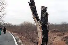 The Joint Security Area's advance camp (Camp Kitty Hawk) was later renamed "Camp Bonifas" in honor of the slain company commander.[15] The Barrett Readiness Facility, located inside the JSA and housing the battalion's north mission platoon, was named for Barrett.[16] The site of the tree, the stump of which was cut down in 1987, became the location of a stone monument with a brass plate inscribed in the memory of both men. The UNC has held commemorative ceremonies at the monument on anniversaries.[17][18]