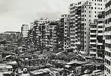 In January 1950, a fire broke out that destroyed over 2,500 huts, home to nearly 3,500 families and 17,000 total people.[12] The disaster highlighted the need for proper fire prevention in the largely wooden-built squatter areas, complicated by the lack of political ties with the colonial and Chinese governments.[13] The ruins gave new arrivals to the walled city the opportunity to build anew, causing speculation that the fire may have been intentionally set.[13][14]
