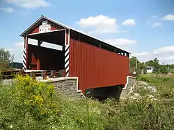 Built in 1881, this historic structure is a 50-foot-long (15 m), Queen Post Truss bridge with a metal roof constructed in 1881. It is one of twenty-eight historic covered bridges that are located in Columbia and Montour Counties.[2]