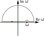 for any closed contour within this region. When the contour is chosen to trace the real axis, a hump over the pole at , and a large semicircle in the upper half-plane. This follows decomposition of the integral into its contributions along each of these three contour segments and pass them to limits. The length of the semicircular segment increases proportionally to , but the integral over it vanishes in the limit because vanishes faster than . We are left with the segments along the real axis and the half-circle around the pole. We pass the size of the half-circle to zero and obtain