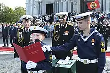 The corps follows the traditions maintained by the original Russian cadet corps in the Imperial Russian Navy.[2] The process of its creation began on 25 April 1995 by order of the Mayor of St. Petersburg Anatoly Sobchak.[3][2] The corps was created at the insistence of President Boris Yeltsin and a joint decision Minister of Defense Pavel Grachev and Mayor Sobchak. On 1 October, the first 75 pupils were enrolled in the corps at Komarovo.[4] On 22 November, First Deputy Commander-in-Chief of the Navy, Admiral Igor Kasatonov presented to the cadet corps its first regimental colours. This day became an official holiday in the school.[5] In early 1996, it was transformed into a naval educational institution. The decree on 19 February of that year established a seven-year training period for the cadet corps. By August of that year, the maximum capacity was determined at 700 pupils. In 2000, the first graduation ceremony took place. On 1 December 2012, Admiral Viktor Chirkov presented new colours to the corps in a presentation ceremony.[6]