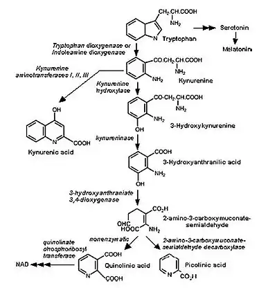 The kynurenine pathway is a metabolic pathway leading to the production of nicotinamide adenine dinucleotide (NAD+).[1] Metabolites involved in the kynurenine pathway include tryptophan, kynurenine, kynurenic acid, xanthurenic acid, quinolinic acid, and 3-hydroxykynurenine.[2] [3] The kynurenine pathway is responsible for total catabolization of tryptophan about 95%.[4] Disruption in the pathway is associated with certain genetic and psychiatric disorders.[5][2][6][7][8]