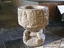 The baptismal font of the church has been described as one of the most unusual fonts in Scania.[1] The sandstone font dates from around 1160 and is richly decorated with sculpted depictions of the Passion of Jesus and the resurrection. The foot of the font contains depictions of battles, including a ship with a dragon's head at the stem, similar to older Viking ships.[1][4] The decoration on the foot may depict the Battle of Stiklestad and the martyrdom of Saint Olaf, and if so is the oldest known depiction of the legend of Saint Olaf in the Nordic countries.[1][2] It was made by the sculptor known by a notname as Majestatis.[1][3][5]