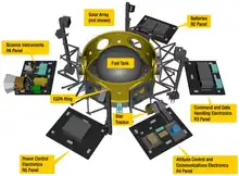 The LCROSS mission took advantage of the structural capabilities of the Evolved Expendable Launch Vehicle (EELV) Secondary Payload Adapter (ESPA) ring[19] used to attach LRO to the Centaur upper-stage rocket to form the Shepherding Spacecraft. Mounted on the outside of the ESPA were six panels that hold the spacecraft's science payload, command and control systems, communications equipment, batteries, and solar panels. A small monopropellant propulsion system was mounted inside of the ring. Also attached were two S Band omnidirectional antennas and two medium-gain antennas. The mission's strict schedule, mass, and budget constraints posed difficult challenges to engineering teams from NASA Ames Research Center (ARC) and Northrop Grumman. Their creative thinking led to a unique use of the ESPA ring and innovative sourcing of other spacecraft components. Usually, the ESPA ring is used as a platform to hold six small deployable satellites; for LCROSS, it became the backbone of the satellite, a first for the ring. LCROSS also took advantage of commercially available instruments and used many of the already-flight-verified components used on LRO.[20]