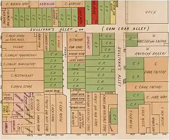 In the mid-19th century, police harassment reshaped the urban geography and the social life of Chinese prostitutes.[3] As early as 1854, the main way to solicit for Chinese prostitutes was streetwalking, which forced those prostitutes to be visible in public spaces. Moral reform groups and the police started to single out some visible Chinese prostitutes' on the major streets in Chinatown, such as Dupont Street, recording them as "Five to six feet rooms 'cribs' filthy holes". From 1854 to 1865, San Francisco police conducted campaigns to drive crib prostitutes away from Jackson and Dupont Streets.[3] Consequently, hundreds of Chinese prostitutes were expelled to side streets and alleys hidden from public traffic. By the 1880s, Chinese prostitutes' cribs and brothels were located in the alleys between Jackson and Pacific Streets. In the 1885's, the San Francisco supervisors reported on the greatest concentration of Chinese prostitutes in Chinatown, including Sullivan's Alley, Bartlett Alley and Stout Alley.[3]