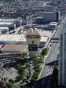 The hotel completed a new 362-foot (110 m), $4-million marquee sign in 1994.[99] Later that year, however, it was partially destroyed by a windstorm.[99] The sign was reconstructed in 1997 for $9 million with a reduced height of 279 feet (85 m), making it the world's tallest free-standing advertising sign.[100][101]