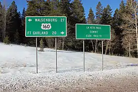 New La Veta Pass (officially North La Veta Pass), elevation 9,413 ft (2,869 m),[1] lies about 1.6 miles northeast of the old pass and is now the principal highway route through this part of the mountain range, carrying U.S. Highway 160.[3] While this new route is slightly higher, it has no sharp curves and is thus better suited to modern highway traffic.