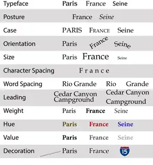 Many of the aspects of type styling can be chosen and controlled by the cartographer when designing a particular label to serve the above purposes. In this sense, they are akin to the visual variables of map symbology; in fact, Jacques Bertin extended his own visual variable system to including type styling in 1980 (in French).[13] This work has largely been ignored in English-speaking countries,[14] although similar ideas have been developed by others.[12][15][5] The most commonly cited and used typographic variables include:
