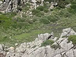 The lake is in the Monte Incudine massif at an elevation of 1,235 metres (4,052 ft).[1] It is in the commune of Figari, on the southeast flank of the Montagne de Cagna above the source of the Ruisseau de Vivaggio.[2] It is a seasonal lake that is dry for much of the year.