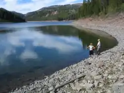 The 3 miles (4.8 km) long, 7,745 feet (2,361 m) elevation, 230-acre (93-hectare), and 200 feet (61 m) max depth Lake Alice is the largest natural lake found in the western portion of the Bridger-Teton National Forest in the state of Wyoming. It is a unique lake that was created thousands of years ago when a massive landslide peeled from the 9,325-foot (2,842 m) Lake Mountain and dammed Poker Creek with debris. The lake's outlet flows below the surface through the natural dam and emerges from the mountain as a creek 1 mile (1.6 km) away. The mountainside scar from the landslide is still visible today. Lake Alice is the home of the only known pure lake strain of naturally reproducing Bonneville cutthroat trout caused by the isolation of the landslide preventing outside genetic influence. At one time the subspecies was thought to be extinct in Wyoming.