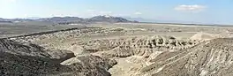 Bird species whose skeletons have been found in sediments of Lake Manix include the western grebe and the white pelican.[2] Other bird skeletons found there have been attributed to the species Aquila chrysaetos (Golden eagle),[60] Branta canadensis (Canada goose),[61] Ciconia maltha (an extinct stork),[62] Erismatura jamaicensis (Ruddy duck),[60] the genus Grus,[60] Nyroca valisineria,[61] Nannopterum auritum (double-crested cormorant), Phoenicopterus copei and Phoenicopterus minutus.[62] These are typical lake-dwelling birds that have also been found at Fossil Lake in Oregon,[60] and might indicate that the lake was a stopover for bird migrations.[63] Mammal genera at Lake Manix included Canis, Felis, Equus, Camelops, Tanupolama, Ovis, Bison, Mammuthus and Nothrotherium.[64] This fauna list, called "Camp Cady local fauna" after a Union Army post in the area,[65] is not exhaustive.[66] The fossils of the Manix Formation have been studied for over a century.[3]