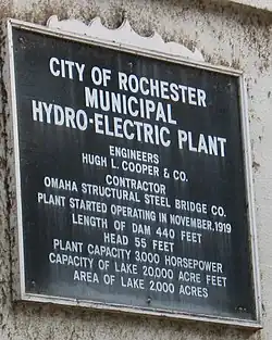 The facility was designed by pioneering hydroelectric engineer Hugh Lincoln Cooper (1865–1937), a Minnesota native with strong ties to the city of Rochester, and was built from 1917 to 1919.[2] It is still operated by its original owner, Rochester Public Utilities (RPU), to supply power to Rochester, Minnesota, 15 miles (24 km) to the south. The Lake Zumbro Hydroelectric Generating Plant was listed on the National Register of Historic Places in 1991 for its state-level significance in the theme of engineering.[4] It was nominated as a representative work of Cooper—one of the nation's leading hydroelectric engineers in the early 20th century—and his only project in his home state of Minnesota.[2]