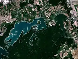 Lakes Amance and du Temple are the two human-made lakes that together form the Aube reservoir. They are located in the Aube department, in the Grand Est region of France. The former is Europe's largest lake reserved for motorboating, and the latter is Europe's largest non-nautical lake.[3] While their normal capacity is 170 hm3, with a total surface area of 23.2 km2 they could, if combined as a single lake, be the third largest man-made lake in France, matching the size of Lac d'Orient.[4] Completed and commissioned in 1989, they are among the last of the great Seine lakes to have been built. Like the neighboring Lac d'Orient, they are part of the Orient Forest Regional Natural Park, created in 1970, twenty years before the project was completed.