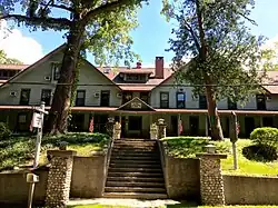 In 1901, John J. and Nancy E. Aylsworth purchased several tracts of land at Lakeside, including the property on which this inn now stands. The construction date of the inn is not documented, but was probably in the early 1910s for the Aylsworths. Along with the inn, several cottages were constructed. John Aylsworth died in December 1917; two years later Nancy Aylsworth transferred the inn to their son Arthur and his wife Grace. At about that time, a substantial addition was constructed on the inn. In 1922, the inn was turned over to the Lakeside Property Owners Trust, a local developer trust tasked with fostering appropriate development and keep out undesirables. The inn remained under Arthur Aylsworth's management, and in 1930 golf, tennis, and swimming facilities were added, and the inn was renamed the Lakeside Park Country Club, and membership was required. Although not explicitly stated, it is likely that these changes were instituted to prohibit Jews from patronizing the inn.[2]
