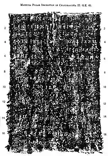 The Lakulisa Mathura Pillar Inscription is a 4th-century CE Sanskrit inscription in early Gupta script related to the Shaivism tradition of Hinduism.[1][2][3] Discovered near a Mathura well in north India, the damaged inscription is one of the earliest evidences of murti (statue) consecration in a temple made to celebrate gurus (preceptors, gurvayatane). It is, according to the Indologist Michael Willis, crucial to understanding the "history of Pashupata Shaivism" and a floruit for the antiquity of its practices.[3] The Lakulisha Mathura inscription is one of the earliest epigraphical evidence of a developed Shaiva initiation tradition.[4][note 1]