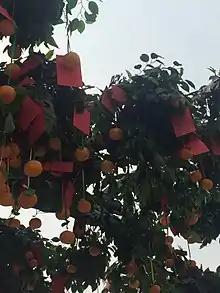 There are four wishing trees in Lam Tsuen. Different trees symbolise various wishes. The first tree prays for career, academic and wealth. The second tree is for marriage and pregnancy. For the third tree, it states anything can be prayed. Yet, the fourth tree is believed to be most special. It is a fake 25-foot wishing tree made of plastic. This plastic fake wishing tree allows worshippers to throw their wishes to the tree, called “Bao Die” in Chinese.[4] A traditional "Bao Die" includes an orange and it ties with a red paper.[5] Worshippers can write their name, date of birth and wishes on the yellow paper and throw it to the wishing tree. If you can successfully throw the "Bao die" and it hangs up on the tree or its branches, the myth said your wishes can come true. However, if it drops, the legend reckoned that your wishes are too greedy. But still, if the "wishes" drop, do not give up, try more and keep throwing until you make your wishes success.[4]