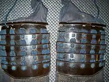 A lame is a solid piece of sheet metal used as a component of a larger section of plate armor used in Europe during the medieval period.[1] It is used in armors to provide articulations or the joining of the armor elements.[2][3] The size is usually small with a narrow and rectangular shape.[3] Multiple lames are riveted together or connected by leather straps or cloth lacing to form an articulated piece of armor that provides flexible protection. The armor worn by the samurai class of feudal Japan used lames in the construction of many of their individual armor parts.[4] The Japanese term is ita, which can both refer to the lame or its borderings.[5]