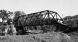 Prior to the present bridge, two bridges have stood at this site. The first was a covered bridge, known as the Tenney Covered Bridge, which was built in 1833, and was swept away in Vermont's devastating 1927 floods. The second bridge, an iron Pratt truss structure, was built by the Berlin Construction Company as part of a major effort by the state to rebuild its bridge infrastructure after the flooding. It was built using standardized guidelines for bridges of its length (111 feet (34 m)), and used rolled I-beams as a means to speed fabrication.[2] That bridge was closed and disassembled in 2007, and replaced by a temporary span.[3]