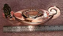 The "Lamp of Brotherhood" presently in Vancouver, British Columbia, Canada, is 31 cm long, 10.5 cm wide, and 14.5 cm high. Text on the upper surface reads: "Fraternitatis Lumen".