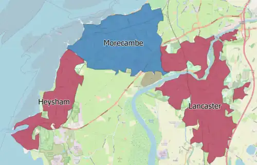 The Lancaster/Morecambe Built-up area is an urban area which comprises the city of Lancaster and the towns of Morecambe and Heysham in Lancashire, England. The urban area covers an area which has a population of 97,150.[1] The urban area includes the suburbs of both Lancaster and Morecambe. It has three subdivisions: Heysham,[2] Lancaster[3] and Morecambe.[4] The built-up area and its subdivisions are entities defined algorithmically by the Office for National Statistics, which considers built-up land separated from another settlement by 200 metres (660 ft).[5]