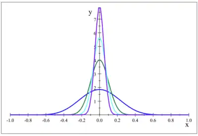 Plotting this function for different values of n reveals that as n goes to infinity, approaches the Dirac delta function, as seen in the image,[1] where the following functions are plotted.