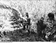 The Japanese positions were well-sited on the spur for an attack from the east along the track from Katika to Sattelberg, but at this point, Captain B. G. Cribb, the commander of D Company, 2/13th Infantry Battalion, came on the radio and announced that he was in contact with the Japanese to the west, and was going to attack from that direction. A furious fight ensured. The Japanese held their fire until the Australians were almost on top of them. Realising that the position was stronger than he had thought, Cribb withdrew after suffering eight dead and twenty wounded.[69][70] Windeyer ordered the 2/17th to bypass the position and proceed to its objective, the high ground south of the Song River. The 2/15th was ordered to attack Katika Spur.[68] The attack was delivered at 15:15 after a preliminary bombardment by 3 inch mortars, but the Japanese defenders had withdrawn, leaving behind eight dead.[70] By nightfall, most of the brigade was on their objectives.[68]