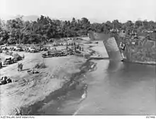The sixth and final wave consisted of LST-18, LST-168, and LST-204.[38] They had instructions to wait until the smaller craft had cleared the beach, and beached at 06:50.[61] Each carried an unloading party of 100 men, drawn from the 2/23rd and 2/48th Infantry Battalions, and 2/2nd Machine Gun Battalion, who would return with the LSTs.[60] The unloading proceeded at a rapid pace. All the cargo was unloaded from two of the three when they retracted at 09:30, and headed off escorted by ten destroyers and the fleet tug USS Sonoma.[61] The 2/3rd Field Company, 2/1st Mechanical Equipment Company, 2/3rd Pioneer Battalion, and the Shore Battalion of the 532nd Engineer Boat and Shore Regiment prepared four beach exits. Stores were quickly moved off the beach to inland dumps.[62][63][58] Some 5,300 troops, 180 vehicles, 32 25-pounders and Bofors 40 mm guns, and 850 measurement tons (960 m3) of bulk stores had been unloaded.[64]