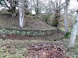 Built on a low hill, the site gave a clear view of the surrounding area and originally would have been a fortified building such as a tower house. The later mansion house is a Category B Listed Building.[3] The date of the completion of the mansion house, 1779, is carved onto a gable skew of a garden shed at the walled garden. The mansion house is three storeys high; the porch may be a later addition. The flanking wings are a Victorian addition.[3] The estate buildings included stables, part of which date from around 1635; Mains Farm; a dovecot and a walled garden of brick enhanced by rusticated, finial ball topped, stone piers.[4]
