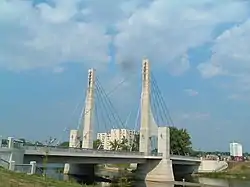 The Lane Avenue Bridge is a cable-stayed bridge over the Olentangy River in the American city of Columbus, Ohio. Designed by Jones-Stuckey Ltd., the construction was completed on November 14, 2003, after only sixteen months, five months ahead of schedule. The bridge is 113 meters (371 feet) in length, carrying six 3.5 meters (11 feet) wide lanes for vehicle traffic, as well as two 3.5 meter sidewalks. The cable stayed design was chosen for aesthetic reasons, as well as having a smaller potential for environmental degradation on the river environment. The anchorages for the cables, at 47 tons (104,000 lbs),[1] are noted as being the heaviest single pieces of steel ever to be galvanized. Total price for the project was US$15.6 million with the following funding sources: