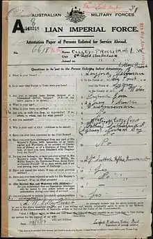 - ↑ Enlistment paper. National Archive of Australia: p. 37. Retrieved 23 November 2013.