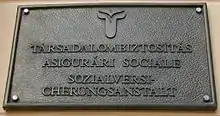 Trilingual (Hungarian, Romanian, German) table in Gyula (meaning "social health insurance")