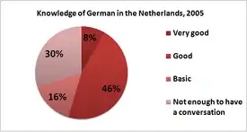 Knowledge of the German language in the Netherlands, 2005. According to the Eurobarometer: 70% of the respondents indicated that they know German well enough to have a conversation. Of these 12% (per cent, not percentage points) reported a very good knowledge of the language whereas 22% had a good knowledge and 43% basic German skills.