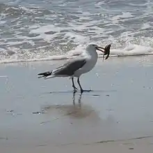 It has a varied diet, including marine invertebrates such as mussels, crabs, sea urchins, and squid; fish such as capelin, alewife, and smelt; insects; and other birds including their chicks and eggs. It often feeds on carrion and human refuse. Food is plucked from the surface of the shore or sea or is caught by dipping underwater or by shallow plunge-diving.[6] They also feed on clams and mussels by dropping them from a height on hard surfaces such as roads or rocks to break their shells. There is some question about whether this behavior is learned or innate, although it seems to be learned.[15]