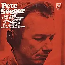 Pete Seeger had been introduced to McCurdy in 1949, and "Last Night I Had the Strangest Dream" in 1950. As a result of this, the song stayed in Seeger's live repertoire.[9] Seeger would play the song, but besides a live bootleg, it was never released on a studio album for six years until it was recorded on March 8, 1956, and subsequently issued on Love Songs For Friends & Foes, which was released that same year.[10] The album was a minor hit and together with the Weavers, Seeger helped popularizing "Last Night I Had the Strangest Dream" to become one of the most well-known recordings.[11][12] The arrangement of the song features Seeger unaccompanied, singing and playing banjo on the recording, which clocks in at approximately two minutes and thirty seconds. In his review for the album, AllMusic critic William Ruhlmann states that the album "was the most political album Seeger assembled", noting the song's inclusion on the record.[13] Seeger would later re-record "Last Night I Had the Strangest" dream for his 1967 studio album Waist Deep in the Big Muddy and Other Love Songs, 11 years after it was first officially released on record.[14]