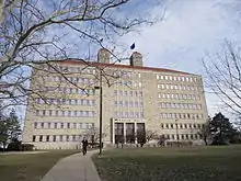 Attempts to begin a university in Kansas were first undertaken in 1855,[111] but it was only after Kansas became a state in 1861 that those attempts saw any real fruition. An institute of learning was proposed in 1859 as The University of Lawrence, but it never opened. When Kansas became a state, provision was included in the Kansas Constitution for a state university.[111] From 1861 to 1863 the question of where the university would be located—Lawrence, Manhattan or Emporia—was debated. On January 13, 1863, Manhattan was made the site of the state's land-grant college,[112] leaving only Lawrence and Emporia as candidates. The fact Lawrence had $10,000 plus interest donated by Amos Lawrence plus 40 acres (160,000 m2) to donate for the university had great weight with the legislature. Eventually, Lawrence beat out Emporia by one vote, and in 1866, the University of Kansas (KU) was opened to students.[111]