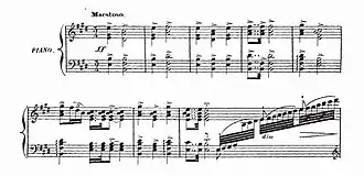 Musically the most diverse role is that of Minka; from the romance-like shape of her Act 1 entrance solo "Hélas, à l'esclavage" by way of the roulades, chromaticism and wide leaps of her 'Chanson tzigane' in Act 2, to the powerful operatic duet in Act 3 with Nangis.[26] On the lighter side, musical parody occurs several times. The 'Ensemble de la conjuration' was compared by contemporary critics to the 'Bénédiction des poignards' in Les Huguenots, while Fritelli's Act 3 couplets end each verse with a quote from the Hungarian March from La Damnation de Faust.[13]