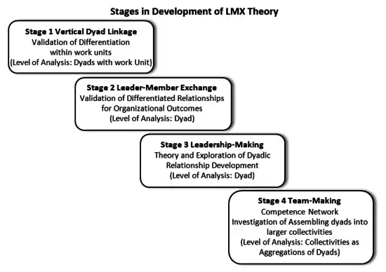 In their 1995 paper titled "Relationship-Based Approach to Leadership: Development of Leader-Member Exchange (LMX) Theory of Leadership over 25 Years: Applying a Multi-Level Multi-Domain Perspective," George B. Graen and Mary Uhl-Bien discuss the development of LMX from through four evolutionary stages.[1]