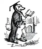 William Blake attacked debased public taste in a poem (c. 1808-11) dedicated to the artist James Barry, writing that the nation which neglected Barry might "give pensions to the Learned Pig / Or the Hare playing on a Tabor".[14] He also alludes to it in his 1784 satire An Island in the Moon.[15] In 1807 Robert Southey parodied the contrast between real genius and meretricious celebrity by referring to the pig, noting that "the learned pig was in his day a far greater object of admiration to the English nation than ever was Sir Isaac Newton."[14] William Wordsworth refers to the pig in The Prelude, describing it as one of the "freaks of nature" to be seen at Bartholomew Fair:
