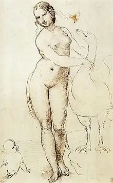 - Studies of Leda and a Horse, black chalk, brush and ink on paper, 1503–1507, Royal Library, Windsor