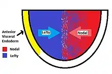 There are many differences between the left and right sides, including heart and lung positioning. Mutations in these genes cause incorrect positioning of these organs (e.g., situs inversus), or in the case of constitutively inactive lefty, the embryo becomes entirely mesoderm and fails to pattern or develop. During vertebrate development, lefty proteins regulate left-right asymmetry by controlling the spatiotemporal influence of the NODAL protein. Lefty1 in the ventral midline prevents the Cerberus (paracrine factor or "Caronte") signal from passing to the right side of the embryo.[1] This spatiotemporal control is achieved by using two sources of excreted lefty. While lefty is produced in response to activated nodal signaling, it is also produced and secreted in the anterior visceral endoderm (AVE). The balance of lefty from the AVE and from Nodal Signaling results in the patterning of the embryo and left-right asymmetry.[7]