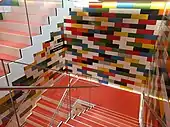 Many features of the building's architecture incorporate the standard design elements of the Lego brick. The modular spaces were built with the exact proportions of a Lego brick, while the white tiles that cover the building also have the proportions of a classic 2x4 brick. In addition, the porthole skylights in the roof of the Keystone Gallery, which sits on top of the entire structure, are circular to mimic eight studs on the top of a Lego brick, and radiate eight beams of light to welcome visitors.[6] The roof terraces were also painted in bright colours to mimic the bright colours of Lego bricks.[7]