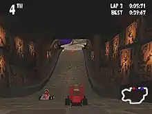 The game's graphics were generally praised by critics. GameSpot's Andrew Seyoon Park stated that virtually everything in the PC version "looks bright, colorful and clean" when playing in 3D-accelerated mode, but called its texturing minimal.[38] Ben Stahl of the same website also called the N64 version's track design "innovative and cute", as well as saying the tracks and backgrounds have a "somewhat real look" that makes it easier to tell where the player should be driving.[37] Trent C. Ward of IGN praised the PC version's background animations, stating that they not only "add to the atmosphere of the game, but also affect the way it plays".[13] However, some reviewers criticised the game's performance, with the website's Sam Bishop stating that the PlayStation version's load times between levels are horrendous[39] and NextGen's Chris Charla calling the N64 version's framerate "nauseatingly slow". Conversely, Winnie Imperio of IGN called the same console version's framerate "consistent, if not entirely smooth".[18]