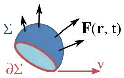 where is a scalar function, D(t) and ∂D(t) denote a time-varying connected region of R3 and its boundary, respectively, is the Eulerian velocity of the boundary (see Lagrangian and Eulerian coordinates) and dΣ = n dS is the unit normal component of the surface element.