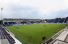 Leinster play their home games primarily at the RDS Arena, although larger games are played in the Aviva Stadium when the capacity of the RDS is insufficient.[1] Before moving to the RDS in 2005, Leinster's traditional home ground was Donnybrook Stadium, in Dublin 4. The province plays primarily in blue with white or yellow trim and the team crest features a harp within a rugby ball, the harp being an ancient symbol of the province found in and taken from the flag of Leinster, although the traditional colours of Leinster Rugby mean the design more resembles the flag of the president of Ireland or the coat of arms of Ireland.