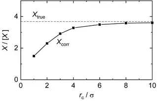 Different corrections schemes have been developed to account for the influence of the long-range interactions in simulations and to sustain a sufficiently good approximation of the 'full' potential.[8][35] They are based on simplifying assumptions regarding the structure of the fluid. For simple cases, such as in studies of the equilibrium of homogeneous fluids, simple correction terms yield excellent results. In other cases, such as in studies of inhomogeneous systems with different phases, accounting for the long-range interactions is more tedious. These corrections are usually referred to as 'long-range corrections'. For most properties, simple analytical expressions are known and well established. For a given observable , the 'corrected' simulation result is then simply computed from the actually sampled value and the long-range correction value , e.g. for the internal energy .[35] The hypothetical true value of the observable of the Lennard-Jones potential at truly infinite cut-off distance (thermodynamic limit) can in general only be estimated.