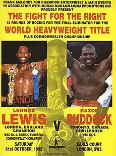 Lennox Lewis vs. Donovan Ruddock, billed as "The Fight for the Right" was a professional boxing match contested on 31 October 1992. The fight was a WBC heavyweight title "eliminator", with the winner scheduled to challenge the winner of the Evander Holyfield–Riddick Bowe championship bout held two weeks later. In addition, Lewis' Commonwealth heavyweight title was also on the line.