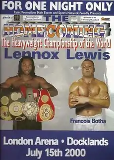 Lennox Lewis vs. Francois Botha, billed as The Homecoming, was a heavyweight professional boxing match contested between WBC, IBF, and IBO champion Lennox Lewis and the WBC's #9 ranked contender Francois Botha. The bout took place on 15 July 2000 at the London Arena in England. Lewis defeated Botha via second-round technical knockout to retain his heavyweight titles.