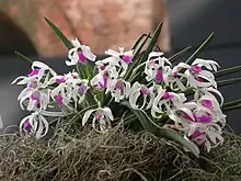 While living in Brazil, the Danish Botanist Johan Albert Constantin Löfgren received an Orchid from Itatiaia, Rio de Janeiro, with flowers reminiscent of the Leptotes, although its lip petal formed a pouch. He described it as Leptotes blanche-amesiae, also noting it had a pending habit and thin flat leaves.[17] Later work on the genus by Frederico Carlos Hoehne led him to conclude that this species, despite being closely related to the Leptotes, would be better placed in another genus. He proposed the genus Loefgrenianthus, in hommage to Loefgren.[18] In 1934, Hoehne also described a new species, Leptotes pauloensis, naming it so because it was found in São Paulo State. This species is closely related to Leptotes tenuis but its flowers have different colors. For decades taxonomists were divided on whether this should be considered a new species, partly due to the fact it was so rare, indeed, Guido Pabst considered it a synonym of L. tenuis.[14] Recently many new colonies have been discovered and Withner now proposes that L. pauloensis should be accepted as a separate species.[9]