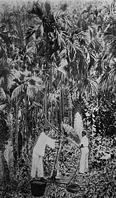 Coleman's major work with the areca farmers was in the management of a major fungal disease of areca caused by multiple species of Phytophthora[27] including Phytophthora palmivora (then called P. arecae). The outbreak of rot began following the rains and the traditional attempts to control them involved climbing the tree and tying what were locally called kotte, a rain protection for the nuts made from the bases of the fronds of the palm. This was a labour intensive process and still resulted in rotten nuts. Additionally the crown of the tree would get infected followed by death of the palm. Coleman experimented with and identified the well-known Bordeaux mixture as an inexpensive solution to control the spread of oospores during the monsoon. Farmers however needed to be trained on how to produce the mixture with careful pH measurement, and to apply it on the growing crown and base of the nuts just prior to the onset of the monsoon. Spray at a height however was a challenge and required new equipment, and Coleman went about organizing import subsidies on sprayers through the agriculture department.